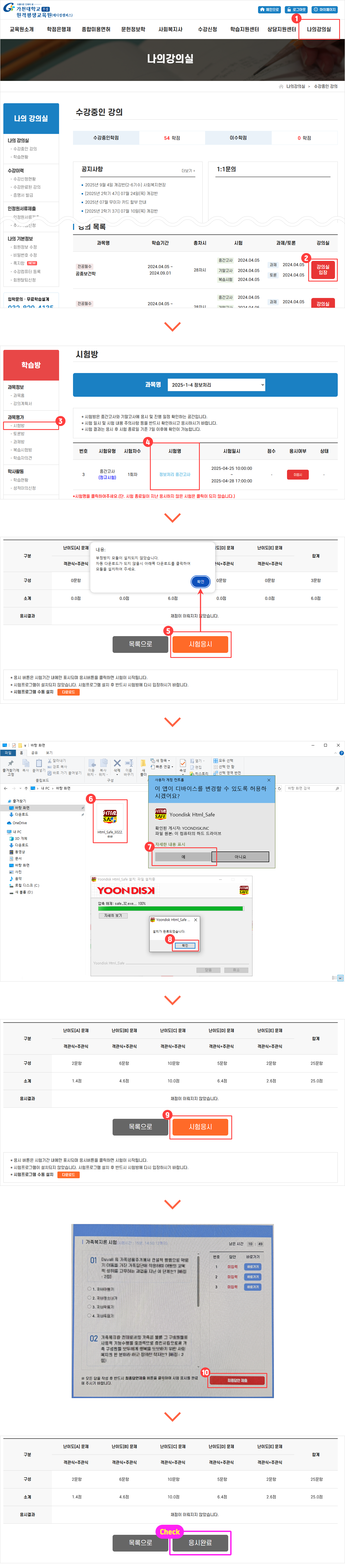 나의강의실 → 강의실 입장 → 시험방 → 시험명 → 시험응시 → 부정행위 방지 프로그램 설치 → 시험응시 → 최종답안제출