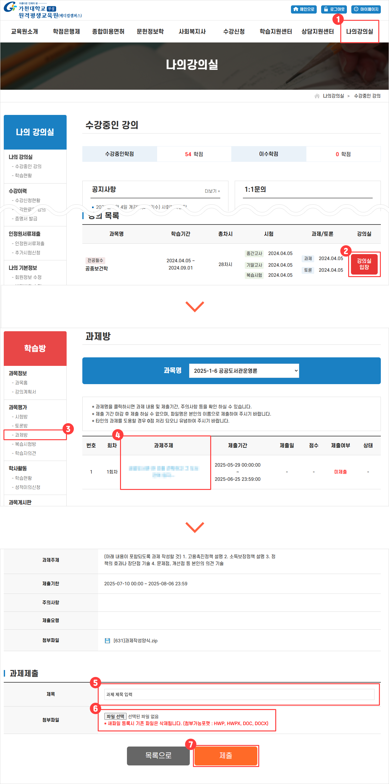 나의강의실 → 강의실 입장 → 과제방 → 과제주제 클릭 → 과제명 입력 → 파일 업로드 → 제출