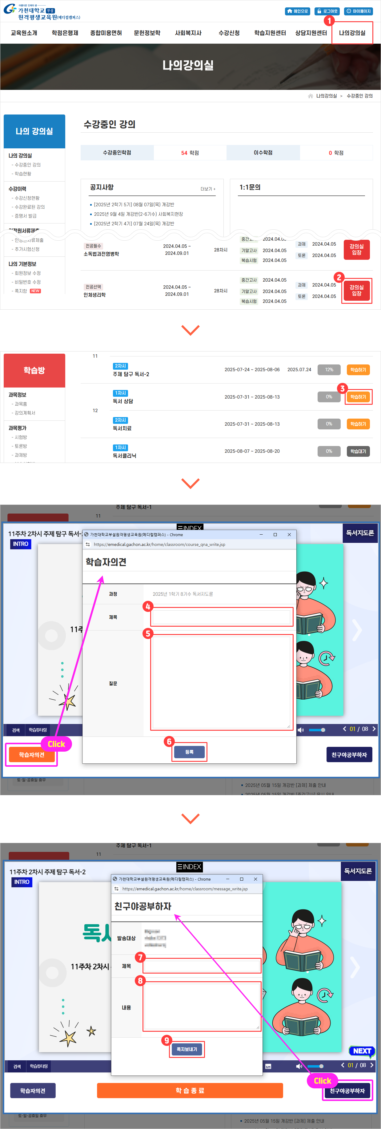 나의강의실 → 강의실 입장 → 학습하기 → 강의창 학습자 의견 → 제목 입력 → 질문 입력 → 등록하기