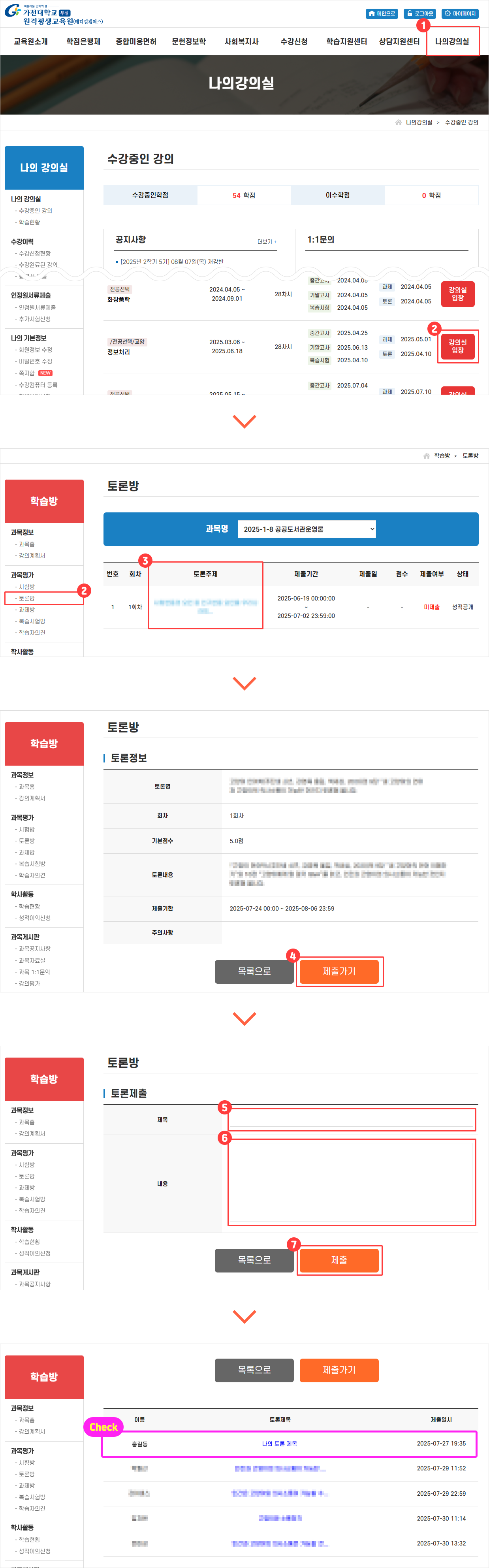 나의 강의실 → 강의실 입장 → 토론방 → 제목 클릭 → 토론 내용 숙지 후 제출가기 → 제목, 내용 입력 → 제출